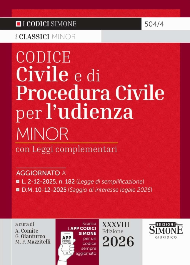 Il Codice Civile e di Procedura Civile per l’udienza Minor 2026, giunto alla trentottesima edizione, si rivolge a quanti (avvocati, magistrati e altri operatori del diritto) hanno la necessità di consultare un codice aggiornato in un formato pratico e maneggevole. Questa nuova edizione è aggiornata ai più recenti interventi normativi tra cui il D.L. 8-8-2025, n. 117 conv. in L 3-10-2025, n. 148 sulla sospensione del procedimento relativo all’Accertamento Tecnico Preventivo obbligatorio (art. 445bis c.p.c.); la L. 23-9-2025, n. 132 sulla competenza del tribunale per le controversie in materia di intelligenza artificiale (art. 9 c.p.c.); la L. 2-12-2025, n. 182 (Disposizioni per la semplificazione) con le nuove norme sulla circolazione dei beni di provenienza donativa; il D.M. 10-12-2025 (Nuovo saggio interesse legale 2026). Rimangono anche in questa edizione gli accorgimenti grafici per facilitare l’operatore nell’applicazione della Riforma Cartabia e del relativo «Correttivo»: il doppio articolato e la losanga laterale per individuare con immediatezza l’articolo modificato, il neretto per l’intervento della Riforma sul singolo articolo ed il corsivo neretto per il cd. Correttivo. Completa il lavoro una mirata ed aggiornata selezione di leggi complementari (tra queste assicurazione, consumatori, crisi d’impresa, equa riparazione, processo telematico, riti semplificati, spese di giustizia, termini processuali, tutela dei diritti umani), ormai divenute sussidio indispensabile per l’udienza e per le quali sono stati utilizzati i medesimi accorgimenti grafici pre e post Cartabia. Un dettagliato indice analitico-alfabetico e un puntuale indice cronologico chiudono il codice consentendo un facile reperimento delle norme. Anche quest’anno la App Codici Simone è uno strumento ulteriore per consultare il codice dal tuo smartphone e averlo sempre aggiornato in tempo reale. L’App, disponibile per Android e iOS, è scaricabile gratuitamente attraverso il QR Code, in calce a questo volume.