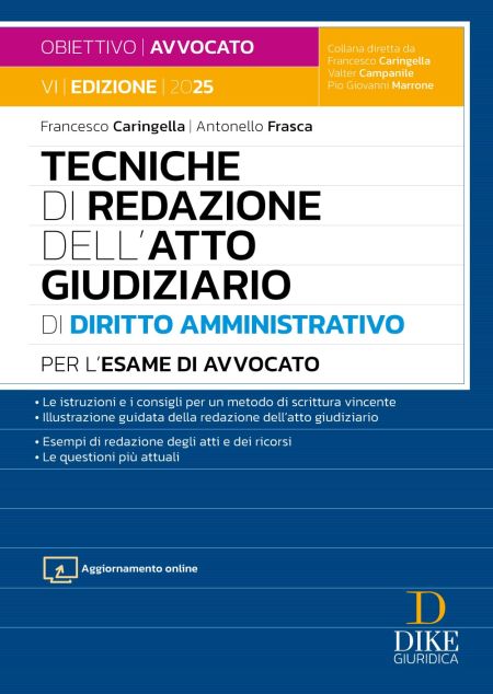 Il testo Tecniche di redazione dell'Atto Giudiziario di Diritto Amministrativo per l'Esame di Avvocato 2025/2026 aiuta l'aspirante avvocato a focalizzare gli aspetti fondamentali per redigere atti esenti dagli errori più comuni e offre una serie di consigli pratici per affrontare le prove dell'esame di abilitazione forense. Il presente manuale di Atti di Diritto Amministrativo per l'Esame di Avvocato, inoltre: propone le giuste coordinate metodologiche per comprendere come migliorare, anche solo con poco esercizio, le proprie attitudini nella redazione degli atti contiene numerosi esempi pratici di atti svolti secondo le tecniche indicate, analiticamente illustrati nei "passaggi logici" e nella struttura del testo scritto struttura ciascun atto nel rigoroso rispetto delle norme primarie e secondarie su criteri e limiti dimensionali dei ricorsi (decreti del presidente del Consiglio di Stato nn. 25/05/15-22/12/16-16/10/17) è aggiornato al Correttivo del codice dei contratti pubblici (D.Lgs. 209/2024) e alla giurisprudenza del 2025 Tecniche di redazione dell'Atto Giudiziario di Diritto Amministrativo per l'Esame di Avvocato fa parte della collana Obiettivo Avvocato di Dike Giuridica, dedicata alla preparazione all'esame di avvocato 2025 - 2026. Scopri tutti i testi nella pagina dedicata.
