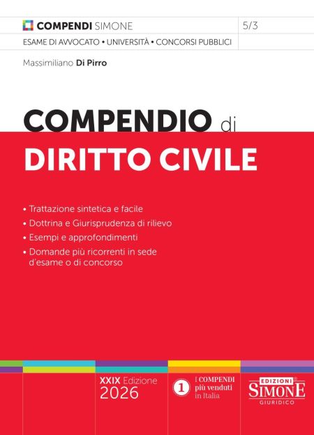 Anche questa XXIX edizione del Compendio di Diritto Civile 2026 presenta l’originale struttura e impianto grafico che caratterizzano i nuovi Compendi Simone. Il linguaggio utilizzato è semplice e immediato e gli istituti fondamentali della disciplina sono esaminati a partire dalla loro definizione, al fine di individuare subito il primo dato indispensabile per proseguire lo studio. Nell’esposizione degli argomenti sono stati utilizzati tre elementi didattici, messi in evidenza con diversi corpi di stampa e con apposite icone. In tal modo sono evidenziati gli approfondimenti, per chi intende esaminare e comprendere maggiormente un tema, gli esempi, che consentono di chiarire un concetto, e le differenze, per definire i tratti caratteristici di un istituto in rapporto con altri simili. Per garantire una conoscenza esaustiva della materia sono poi riassunti, in appositi box con fondino, gli orientamenti più rilevanti di dottrina e giurisprudenza (si segnalano le ultime sentenze dalla Corte costituzionale sull’adozione dei single, sul riconoscimento del figlio da parte della madre intenzionale, sul cognome dell’adottato nell’adozione in casi particolari). Là dove realmente necessario viene evidenziato, sempre in box, il riferimento normativo indispensabile per lo studio. Come sempre, nei Compendi Simone un occhio attento è riservato alle tematiche di stretta attualità e alle novità legislative, tra cui si segnala la L. 182/2025 in materia di assenza, morte presunta, restituzione dei beni di provenienza donativa. In chiusura di ogni capitolo, infine, sono riportate le domande più ricorrenti in sede di esame o di concorso, in modo da verificare immediatamente il livello di preparazione raggiunto. Per tali caratteristiche, il nuovo compendio diventa uno strumento di studio indispensabile per chi intende sostenere l’esame di avvocato, un concorso pubblico o preparare un esame universitario.