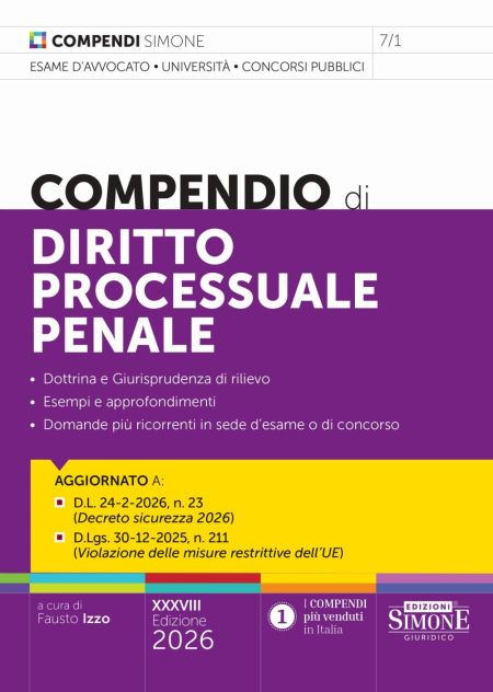 La nuova edizione del compendio, già profondamente rinnovata nella struttura e nei contenuti alla luce della Riforma Cartabia, continua ad offrire un quadro completo, seppur di sintesi, della procedura penale. La trattazione, che segue l’ordine del codice, ricostruisce tutti i principali istituti e consente uno studio rapido ed esaustivo della materia. In chiusura di ogni capitolo sono, inoltre, riportate le domande più ricorrenti in sede di esame o di concorso, in modo da permettere di verificare immediatamente il livello di preparazione raggiunto e cimentarsi con la prova d’esame. Questa nuova edizione è aggiornata a tutte le novità normative, tra le quali meritano di essere segnalate la L. 47/2025 in materia di intercettazioni, il D.L. 48/2025 conv. in L. 80/2025 (Decreto sicurezza 2025), la L. 181/2025 che ha introdotto il delitto di femminicidio, il D.Lgs. 211/2025 in tema di violazione delle misure restrittive imposte dall'Unione Europea e, da ultimo, il Decreto Sicurezza 2026. Per tali caratteristiche, rappresenta uno strumento di studio indispensabile per coloro che devono sostenere l’esame di avvocato, preparare un esame universitario o affrontare un concorso pubblico.
