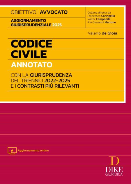 Il Codice Civile Annotato per l'Esame di Avvocato 2025/2026 con Aggiornamento giurisprudenziale è annotato con le massime della giurisprudenza di legittimità, e pone una particolare attenzione alle pronunce più importanti e significative dell'ultimo triennio, rappresentando un utile aggiornamento giurisprudenziale per tutte le edizioni precedenti dei codici annotati in commercio. Il Codice evidenzia le questioni oggetto di contrasto con l'indicazione dell'orientamento difforme o parzialmente difforme e fa precedere le tematiche di assoluta attualità da una o più massime di carattere generale che descrivono l'istituto. Il Codice Civile per l'Esame di Avvocato inoltre: costituisce un utile sussidio di aggiornamento dei tradizionali codici contiene una sapiente selezione delle tematiche che maggiormente possono essere oggetto di traccia o del caso da risolvere è necessario non solo per l'esame di avvocato, ma anche per gli operatori del settore: avvocati e magistrati riporta un dettagliato indice analitico che consente una rapida individuazione delle questioni è aggiornato alla importantissima sentenza a Sezioni Unite sulla rinuncia alla proprietà dell'agosto 2025 grazie all'aggiornamento online sarà aggiornato da tutte le norme e le principali decisioni che dovessero sopravvenire fino a giugno 2026 In questa edizione presenta due importanti novità: contiene anche il codice di procedura civile consente l'accesso gratuito, fino alla data dell'esame, al Quotidiano Giuridico online Jusdì, con le principali sentenze appena depositate Per tutte queste caratteristiche, il Codice annotato di Diritto Penale rappresenta un indispensabile strumento per la prova scritta dell'esame di abilitazione forense, nonché per la prima fase della successiva prova orale consistente nella discussione di una questione pratico-applicativa. Scopri la collana dedicata Obiettivo Avvocato di Dike Giuridica con Codici, Tecniche di Redazione, Atti Giudiziari e Compendi per l'Esame di Avvocato.