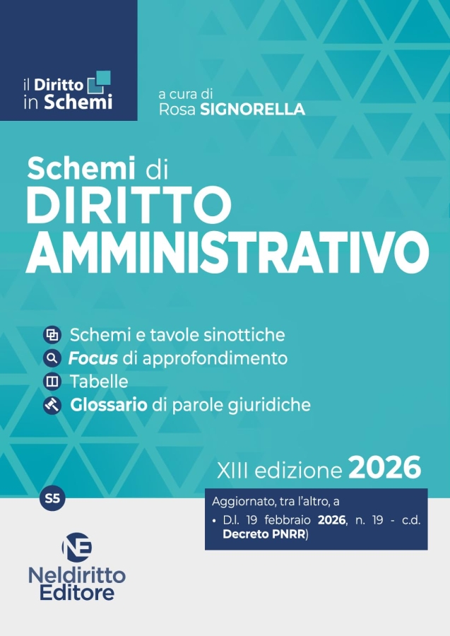 Schemi di Diritto Amministrativo con tabelle e parole chiave per una preparazione rapida ma completa. La Collana "Il Diritto in Schemi" intende fornire un utile supporto per l'apprendimento e il ripasso delle principali discipline oggetto di esami e concorsi. Gli "Schemi" guidano lo studente e il concorsista nello studio delle materie, aiutandolo a focalizzare l'attenzione sulle nozioni fondamentali e sugli aspetti principali di disciplina di ogni argomento, sulle analogie e le differenze tra gli istituti, sui profili meritevoli di approfondimento perché oggetto di attenzione da parte della dottrina e della giurisprudenza. I volumi sono caratterizzati dalla schematizzazione degli argomenti, che rende possibile una chiara e immediata comprensione e un'agevole memorizzazione, ed in particolare contengono: * schemi e tavole sinottiche; * tabelle di comparazione tra istituti; * focus di approfondimento; * particolari accorgimenti grafici, quali l'uso di simboli, elenchi puntati e grassetti, per sviluppare la memoria visiva. Tali elementi rendono i volumi una guida pratica per chi vuole prepararsi alla materia partendo dalle nozioni di base e dagli istituti fondamentali o per chi necessita di un ripasso veloce nell'imminenza della prova, fungendo anche da utile strumento da affiancare a manuali e compendi. In questa XIII edizione 2026, il Volume tiene conto delle più importanti novità normative, tra cui quelle introdotte dal D.l. 24 febbraio 2026, n. 23 (c.d. Decreto PNRR) e dalla L. 07 gennaio 2026, n. 1 (Responsabilità erariale). Numerosi gli spunti tratti dal più recente dibattito giurisprudenziale. Ad arricchire il Volume è inserito, in chiusura, un Glossario di parole giuridiche, in cui sono indicati istituti o principi non trascurabili nella preparazione, con la essenziale definizione.