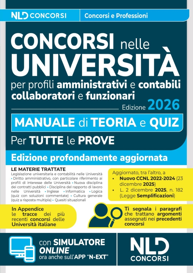 Il Manuale Concorsi nelle Università per profili amministrativi e contabili, Teoria e Quiz, NLD Concorsi, 2026 è stato pensato per assicurare, per ciascuna delle materie normalmente assegnate negli ultimi concorsi, una trattazione completa, aggiornata e, al contempo, schematica e fluida delle seguenti materie: Legislazione e contabilità universitaria; Diritto amministrativo, con particolare riferimento ai profili di interesse delle Università; Nuova disciplina dei contratti pubblici; Disciplina del rapporto di lavoro nelle Università; Inglese; Informatica; Logica (quiz con soluzioni commentate); Cultura generale (quiz a risposta multipla); Quesiti situazionali. Tra i tantissimi aspetti esaminati sono stati minuziosamente approfonditi quelli più di frequente assegnati negli ultimi concorsi indetti dalle Università italiane. Tra i tanti: statuto e regolamenti delle Università (classificazione, iter di approvazione e controllo); strumenti di gestione della performance nelle Università; fasi di costruzione del budget, documenti e principi contabili; progetti di ricerca europei, Horizon Europe, PRIN, fonti di finanziamento delle Università e PNRR; procedure di accreditamento delle sedi e dei corsi e documentazione richiesta; diritto allo studio; organi universitari e strutture organizzative; professori, ricercatori, dottorati e personale; didattica, ricerca e assistenza; corsi di laurea, master e orientamento; fasi del procedimento amministrativo, informatizzazione, documentazione amministrativa, trasparenza e accesso, anticorruzione e privacy nelle Università, amministrazione digitale algoritmica, semplificazione e liberalizzazione. Il Volume, inoltre, è profondamente aggiornato alle più recenti novità legislative, tra cui la L. 7 gennaio 2026, n. 1 (Responsabilità erariale), il nuovo CCNL 2022-2024 sottoscritto il 23 dicembre 2025, la L. 2 dicembre 2025, n. 182 (L. Semplificazioni), la L. 10 novembre 2025, n. 167 (Legislazione universitaria). Il Manuale: contiene in Appendice una raccolta delle tracce assegnate nei più recenti concorsi indetti dalle Università italiane; segnala, inoltre, paragrafo per paragrafo, gli argomenti già oggetto di prove assegnate in precedenti concorsi banditi dalle Università. All'illustrazione della disciplina seguono batterie di quiz, utili per saggiare la preparazione e simulare la prova. Il Manuale consente infine l'accesso ad un simulatore online, consultabile con apposita password presente nel volume, per continuare ad esercitarsi in attesa della prova concorsuale.