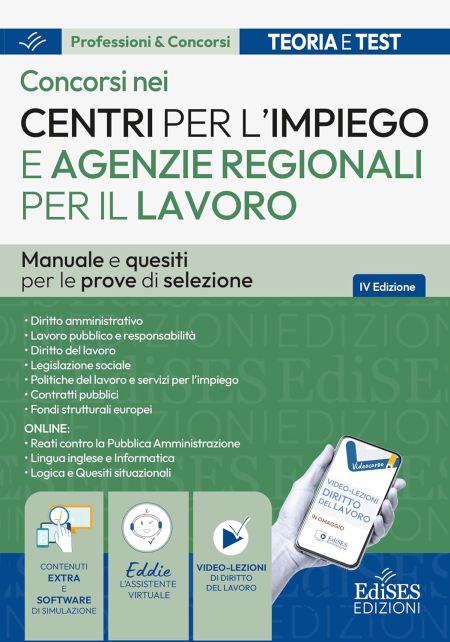 Manuale consigliato per la preparazione ai concorsi banditi dalle Regioni o dalle Agenzie regionali per il lavoro per l'assunzione di personale da destinare al potenziamento dei Centri per l'impiego (CPI). Questo volume riporta le materie comunemente richieste dai concorsi per il potenziamento dell'organico dei Centri per l'Impiego (CPI) e delle Agenzie per il lavoro regionali: diritto amministrativo e disciplina del lavoro pubblico; diritto del lavoro e legislazione sociale; politiche del lavoro e servizi per l'impiego; disciplina dei contratti pubblici; normativa in materia di finanziamenti europei, nello specifico le attività del FSE+ (Fondo sociale europeo plus). Apposite sezioni online sono dedicate ai reati contro la P.A., spesso oggetto di prova nei bandi di concorso, nonché alla lingua inglese e all’informatica, competenze necessarie per l’accesso alle Pubbliche Amministrazioni. In omaggio con il volume: una serie di quesiti a risposta multipla; il software per effettuare infinite simulazioni delle prove di selezione; un coupon per l'acquisto del video-corso light di diritto del lavoro; Eddie, l’assistente virtuale EdiSES basato sull’Intelligenza artificiale, che semplifica la preparazione.
