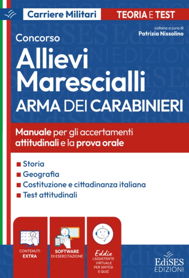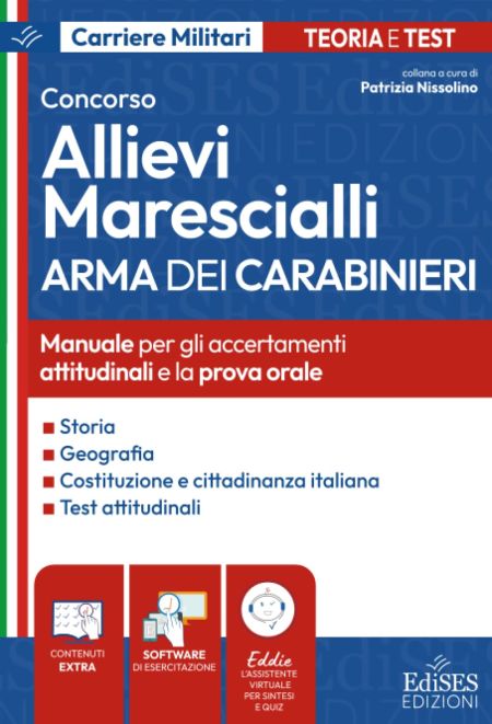 Manuale per la preparazione alle fasi successive alle prove scritte del concorso per Marescialli Carabinieri: accertamenti attitudinali e prova orale. Il manuale è articolato in Parti. La Parte Prima fornisce indicazioni sulla figura professionale del Maresciallo e sulle prove che ciascun concorrente dovrà affrontare partecipando al concorso. La Parte Seconda propone una serie di test di personalità e intellettivi. La Parte Terza espone il programma della prova orale (Storia; Geografia; Costituzione e Cittadinanza italiana) sviluppando tutte le tesi, argomento per argomento, come previsto dal bando di concorso. All'interno del volume, un codice personale permette di accedere gratuitamente al software online per effettuare infinite esercitazioni della prova scritta d'esame. Il testo, inoltre, è accompagnato da Eddie, l’assistente virtuale EdiSES basato sull’Intelligenza artificiale, che semplifica la tua preparazione.