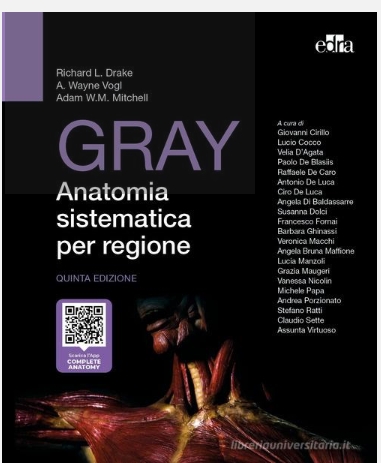 "Gray. Anatomia sistematica per regione" è una risorsa moderna e aggiornata concepita per lo studio dell'Anatomia umana per le nuove generazioni. Il volume espone le conoscenze fondamentali, presentate in un formato didatticamente efficace, per lo studio del corpo umano a supporto delle discipline cliniche e chirurgiche. Ciascun capitolo è dedicato a un distretto anatomico: dorso, torace, addome, pelvi e perineo, arto inferiore, arto superiore, testa e collo. La trattazione di ciascun argomento, al fine di favorire l'apprendimento, è articolata in tre macro-sezioni: panoramica concettuale, anatomia sistematica, anatomia di superficie. La descrizione della struttura degli organi è macroscopica e microscopica. Uno specifico capitolo dedicato al sistema nervoso centrale completa l'opera. Curato da un ampio gruppo di anatomisti, il testo è arricchito da oltre 1000 illustrazioni innovative e originali che presentano la struttura del corpo umano in modalità chiara e fruibile. A corredo del volume un'ampia selezione di approfondimenti clinici, che non interrompono lo studio dell'anatomia perché consultabili sul sito dedicato (www.studenti33.it/gray5), di supporto alla comprensione del senso delle conoscenze anatomiche nella pratica medica. Valore aggiunto che fa dell'opera uno strumento digitale evoluto a disposizione degli utenti è l'accesso all'app Complete Anatomy per uno studio interattivo e personalizzato della materia.